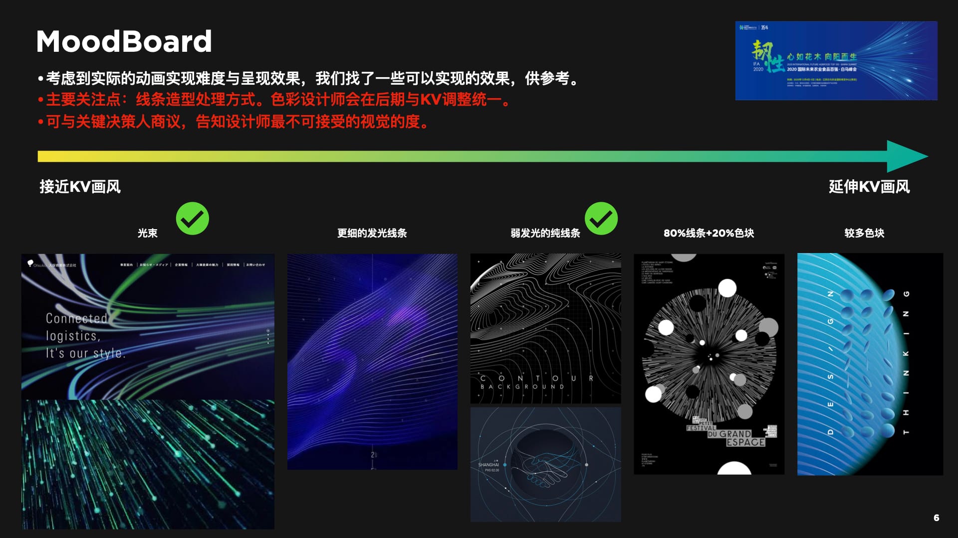 考虑到实际的动画实现难度与呈现效果,我们找了一些可以实现的效果,供参考。对于参考图的选择,我们主要关注线条造型处理方式。色彩会在后期与KV调整统一,与关键决策人商议,告知设计师最不可接受的视觉的度,再根据双方的沟通做设计。