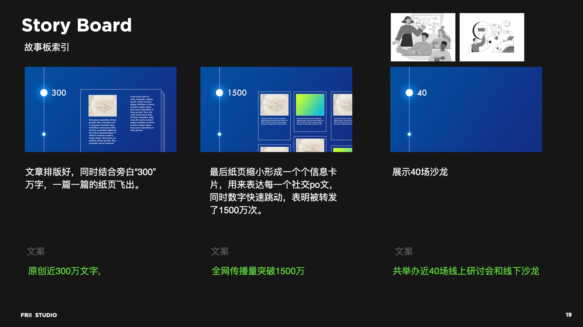 确定好视觉风格后,我们开始在客户提供的对白上构想分镜,经过多次调整,我们的到以下较高保真的StoryBoard。