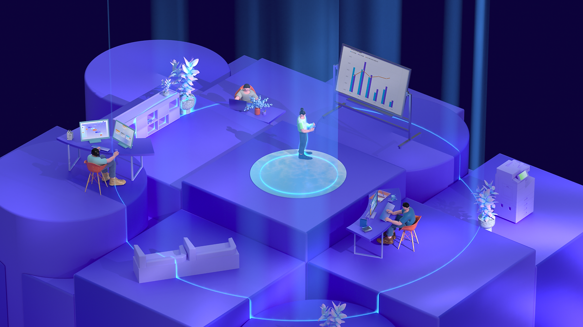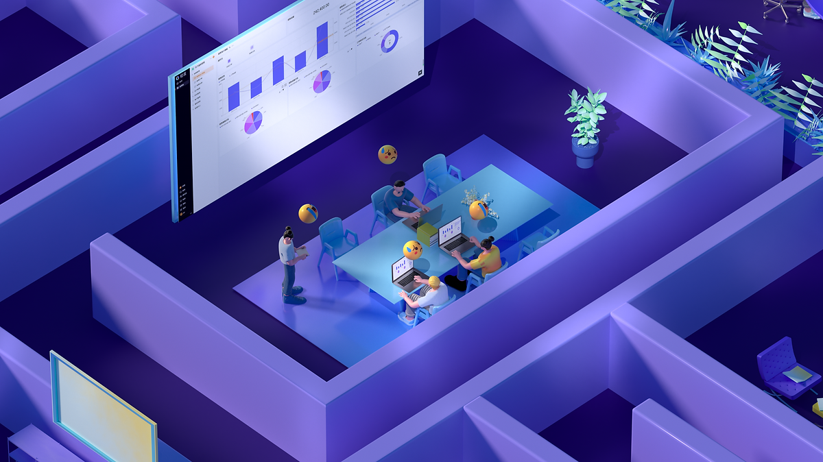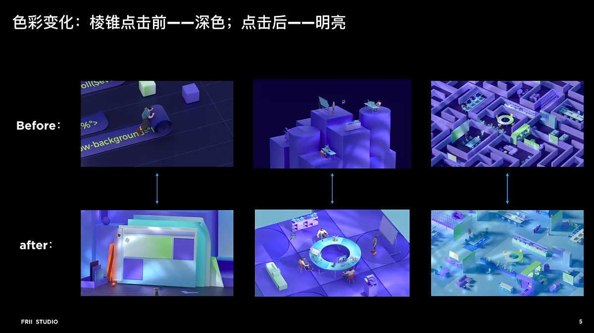 对部门/小组织带来的变化:在高低不齐的台子上的角色,受到信息不平衡、位置与角度有差异、信息孤岛等象征性的困境,当棱锥点击后,高低台子拉齐,成为系统密切的平台与圆桌。