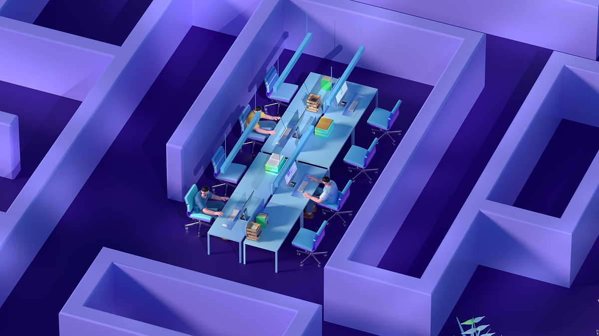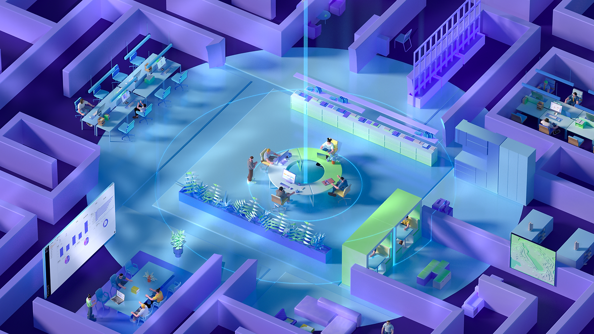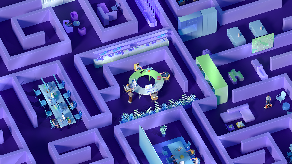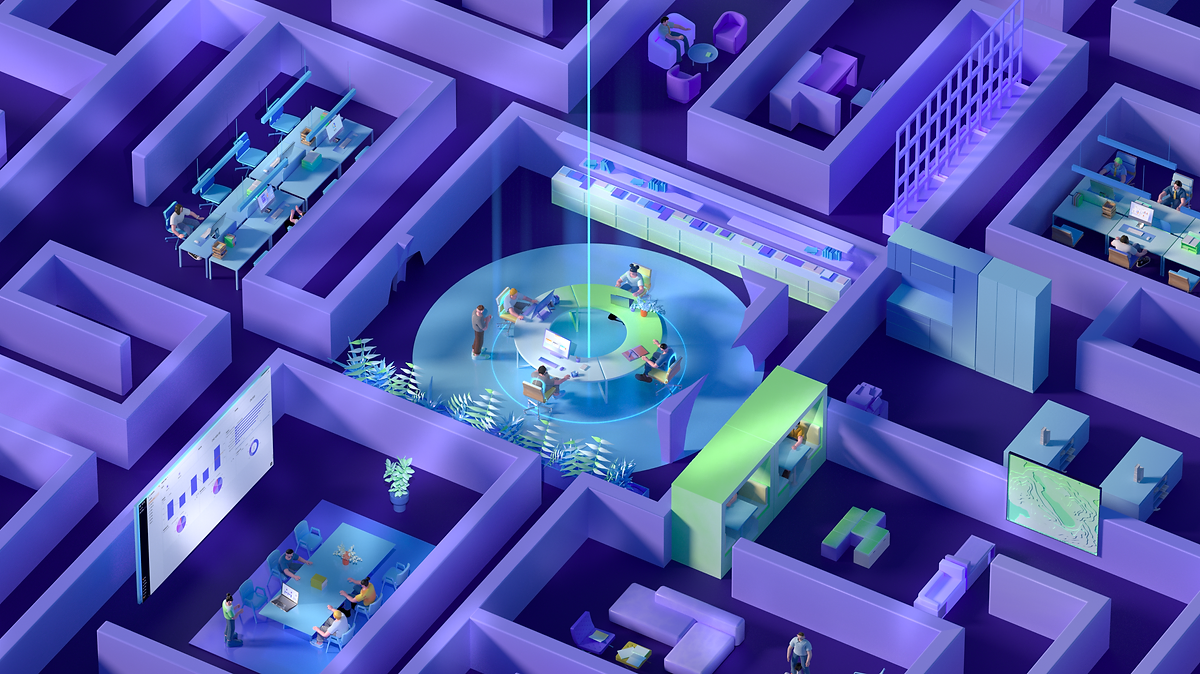 对更大的组织/大企业带来的变化:多个部门在迷宫中隔绝,通过棱锥的click,高墙被打破,组织得以重组,并高效的协同,人员自由地穿行。