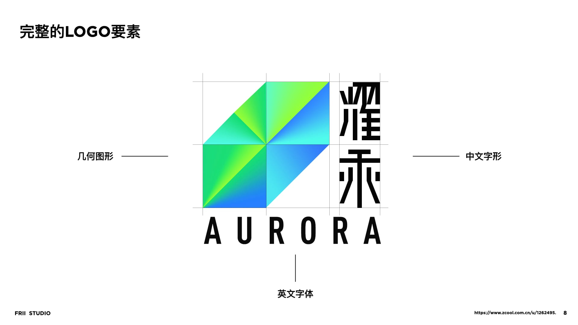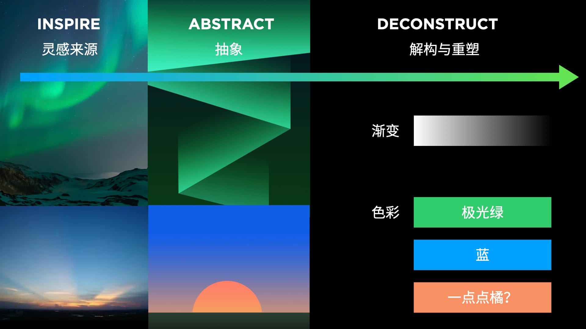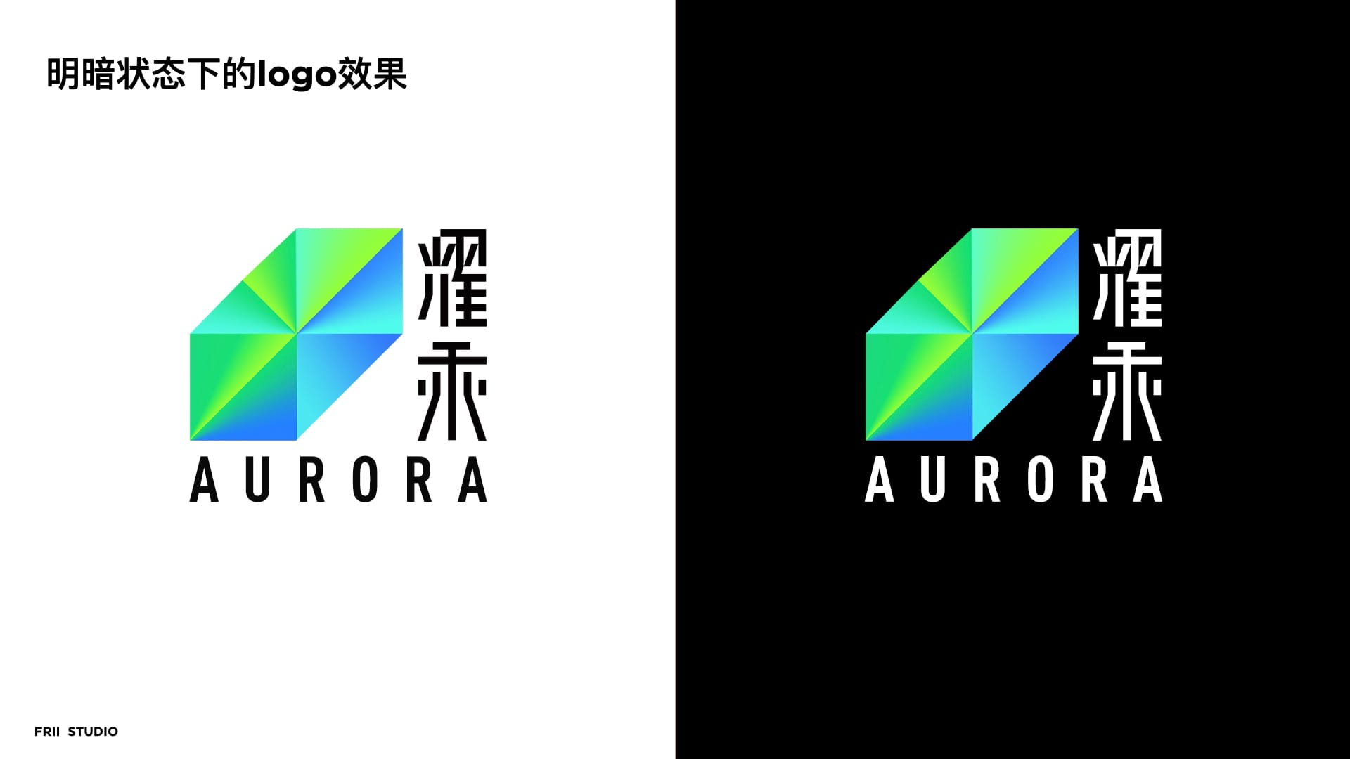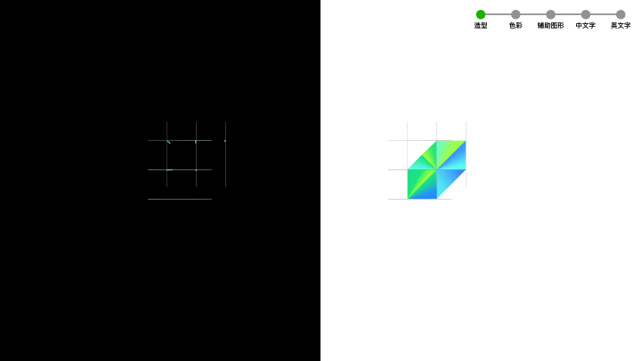 从AURORA极光的意向出发,我们对色彩与造型做了抽象。将客观表现提取成主观存在,这一步,每一位设计师都会有不一样的主观表达,这也是相同命题下,会产生不同方案的原因。而这都逃不开我们约定的“人格气质”。最后,我们归纳出视觉表达手法“渐变”与“切割”,将这两个手法进行logo造型建立。