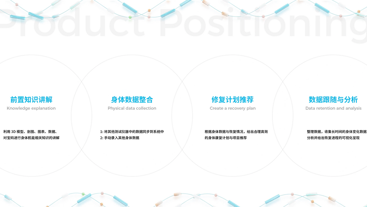 人群需要:主流的健康/医疗领域已经陆陆续续有很多数字化的APP介入,为其提供了很多便利。产后健康是泛健康领域中的分支,相对于主流的健康/医疗领域来说,他们得到的数字化技术的融入与助力相对较少。而现阶段的生育现状带来的「优生」观念,挖掘出更多中产母亲对自身产后健康的关注与护理需求。这些需求亟待被满足,而另一边又缺少数字化产品的助力,我们发现了这个矛盾,并以此为机会,进行了此次的设计。