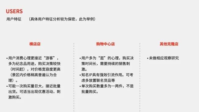对于用户,我们从品牌团队和运营团队得到的数据尚少,无法给出具体的人物Persona(用户画像);但通过店员与工作人员描述,我们大致能够得到几个人物色彩特征明显的用户特征。