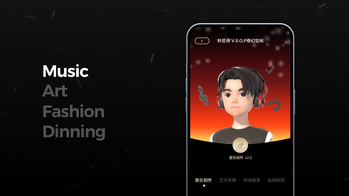 轩尼诗奇幻空间里面有很多板块,包含了奇幻空间、奇幻派对、轩尼诗挚樽会、以及音乐创作、艺术先锋时尚探索、品味时刻等4个主题的活动内容呈现。该页面上线的时间节点,是为了结合春游音乐节的活动与王嘉尔新歌形成加持,届时客户希望在奇幻空间网页尝试3D人物Avatar。