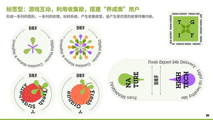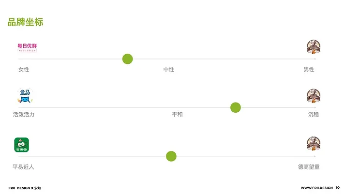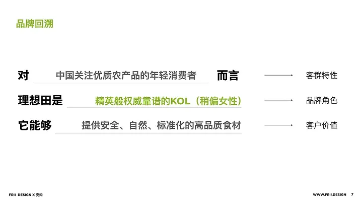 用生鲜市场中个性突出的品牌作为坐标轴,以视觉、故事、气质作为讨论的对象,并以这些坐标轴作为我们划定品牌气质的尺度。同时,以一位“精英般权威靠谱的女性KOL”为人格定义,使得我们在设计过程中,紧紧去贴合这样的人格形象。大大减小了偏航的可能性。