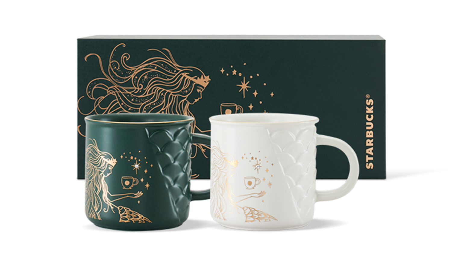 本次开业的主题杯依然是经典的白绿系列,主角是这对女神款周年对杯,绿色采用了星巴克的经典绿,配上熟悉logo的女神图标,杯壁采用了一些设计模拟美人鱼的鳞片形状,传承经典却又不落俗套。