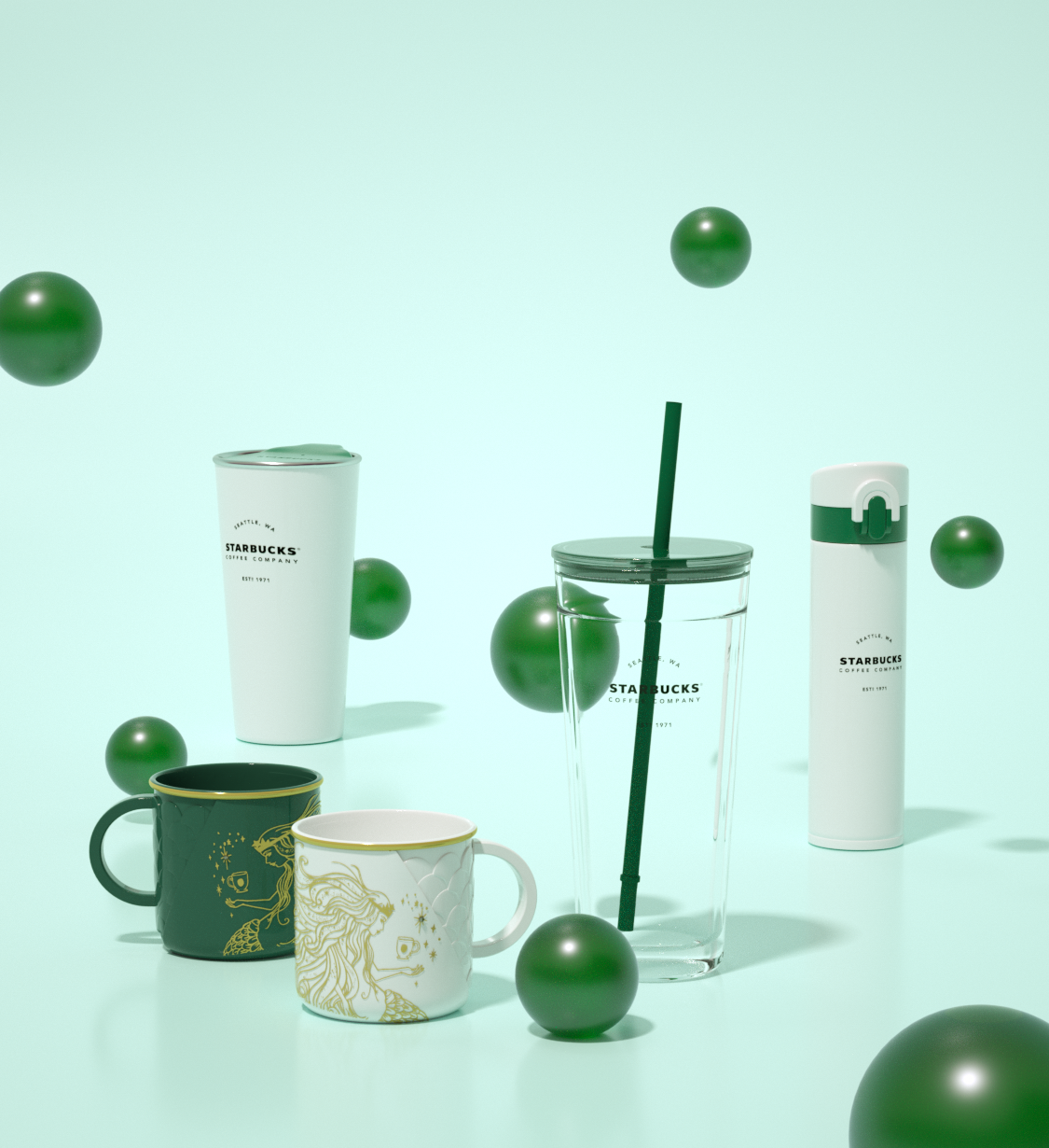 本次开业的主题杯依然是经典的白绿系列,主角是这对女神款周年对杯,绿色采用了星巴克的经典绿,配上熟悉logo的女神图标,杯壁采用了一些设计模拟美人鱼的鳞片形状,传承经典却又不落俗套。