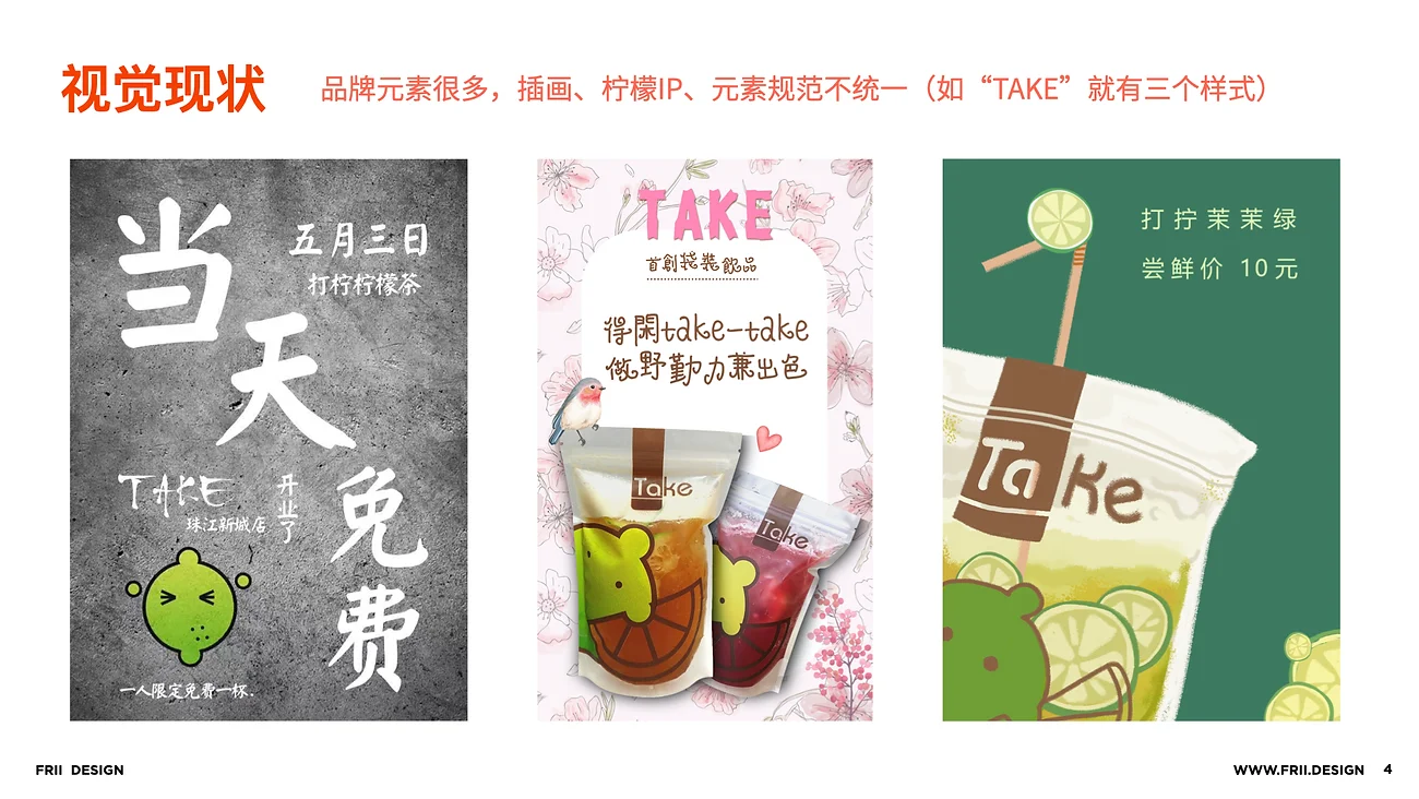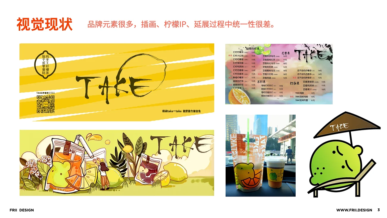 TAKE的视觉元素为毛笔、水墨、在落地实操上难以延展、统一。LOGO+插画系统+IP视觉风格难以调和,使得每类元素只能单独出现,难以形成视觉聚力,难以对用户产生视觉记忆点。