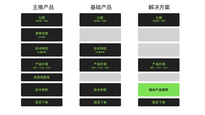 产品:主推产品(页面模块多,包含场景动画);一般产品;解决方案;