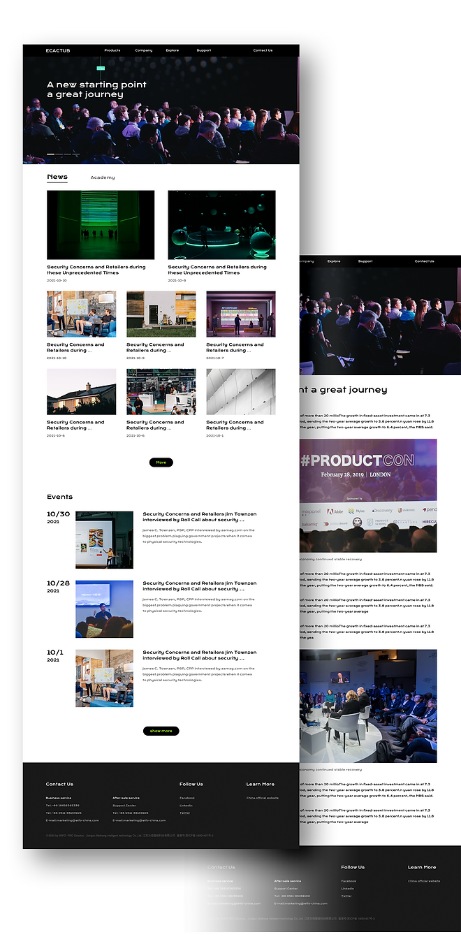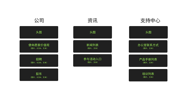 公司:公司文化呈现类;业务类:招聘、联系、支持中心、新闻。